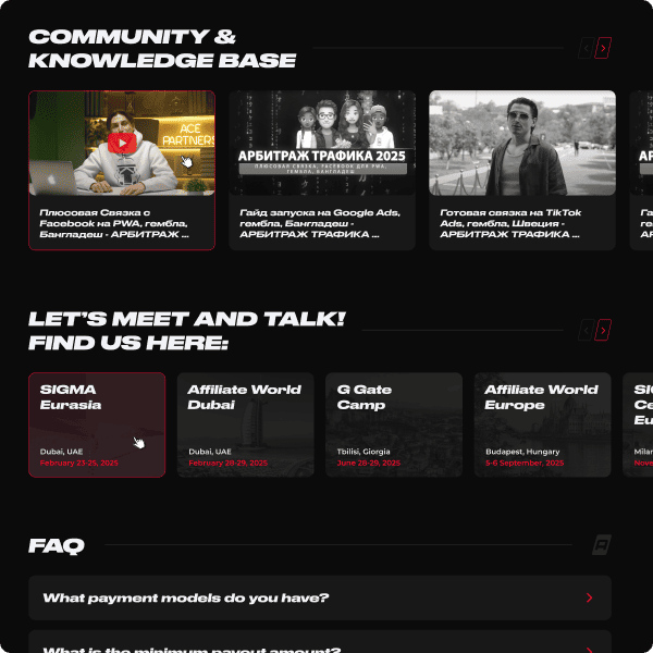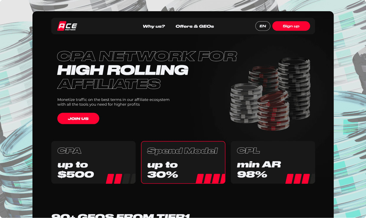 Ace Partners needed a modern and confident landing page to represent their affiliate network and attract new partners. We designed a bold, conversion-focused interface with a clear value proposition, strong visual hierarchy, and adaptive layouts for all devices.The result is a sleek landing page that communicates trust, performance, and scalability.